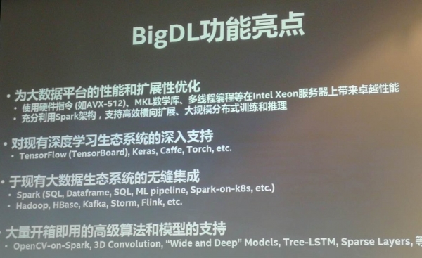 BigDL是一个基于Apache Spark的开源分布式深度学习框架,于2016年12月对外正式发布。“我们的目的是让深度学习和大数据平台能够无缝、非常容易地结合在一起,使得深度学习更易于被大数据的社区和数据科学的社区使用。”英特尔高级首席工程师、大数据技术全球CTO戴金权谈及研发这个软件的原因时表示。