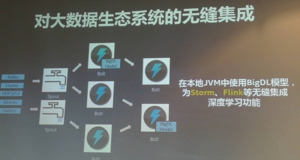 “当深度学习被越来越多的人所接受后就希望它能够应用在生产中,而在构建新的人工智能深度学习应用时,那些普通大数据的用户尽管拥有大数据工程师或者数据科学家、数据分析师,但这些人很可能只会写SQL,并不擅长编程代码,也不是深度学习的专家,他们过去主要使用Hadoop、Spark平台来管理数据,对数据进行SQL处理、流分析,或者做一定的数据挖掘、机器学习、图分析等。”戴金权表示,这些人使用的一整套工具、架构和深度学习社区的工具、架构之间是有“断层”的,有了BigDL之后这些人就可以顺利填补这个“断层”。
