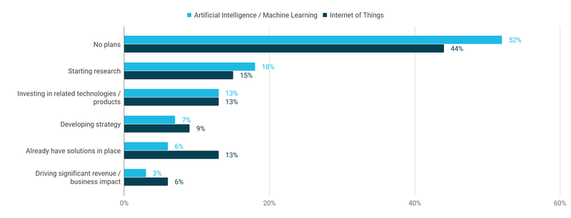 超过50%的受访企业表示,他们并没有计划在2018年研究或实施人工智能(AI)或机器学习(ML)解决方案。超过40%的受访企业表示对物联网(IoT)也持同样的态度。对于大多数IT组织机构来说,这些新兴技术领域仍然处在“新兴”过程中,并不是2018年的首要任务。随着上游开源创新推动这些领域的发展,红帽预计在未来的调查中将会看到企业陆续推出相关的采用计划。