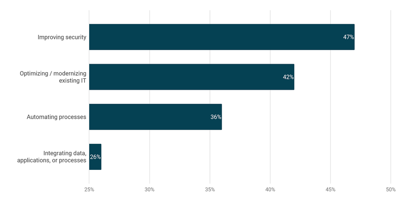 现代化现有IT投资仍然是许多企业面临的首要挑战(和优先工作):根据2017年的调查,大多数企业都在进行数字化转型。但今年,42%的受访企业将优化和现代化现有IT投资列为2018年的首要挑战。其他的主要挑战还包括提高安全性(47%)、流程自动化(36%)以及数据、流程和应用的整合(26%)。此外,31%的受访企业认为,今年将会优先提供资金用于现代化现有IT投资。