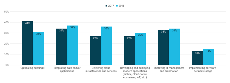 IT支出正在发生变化:尽管2017年的支出主要集中于优化现有IT,但大部分受访企业目前正计划将更多预算用于以下领域:提供云基础架构和服务(36%)、整合数据和应用(76%)以及开发和部署现代应用(30%)。