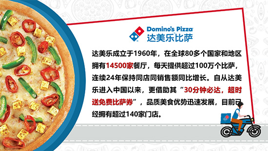 达美乐成立于1960年,在全球80多个国家和地区拥有14500家餐厅,每天提供超过100万个比萨,连续24年保持同店同销售额同比增长。自从达美乐进入中国以来,更借助其“30分钟必达,超时送免费比萨券”,品质美食优势迅速发展,目前已经拥有超过140家门店。