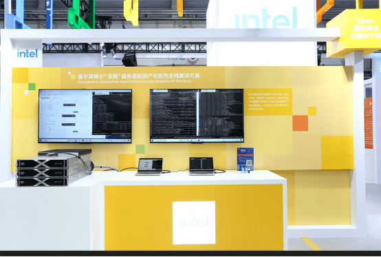 在Linux 操作系统与解决方案展台上,英特尔展示了基于英特尔?至强?服务器的国产化软件全栈解决方案。展台上,通过由 3 台服务器组成的一套超融合环境,部署包括 OpenEuler、OpenAnolis、OpenCloud OS 国产操作系统的 SmartX 超融合软件、Gbase 数据库软件、用友 OCR 实时识别用例和金蝶 NLP 实时处理用例,全面展示了基于英特尔? 至强?服务器支持全栈国产软件应用的能力,为用户提供了最佳的解决方案和服务。