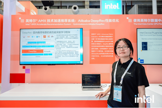在Alibaba DeepRec 性能优化的演示中,展现了阿里巴巴面向推荐场景的开源高性能深度学习框架。该框架利用英特尔 AMX 技术进行优化,大幅提升了计算性能。除此之外,展台上还提供了使用英特尔数据中心GPU 来加速人工智能模型,与英特尔一起拥抱生成式人工智能,以及从云端到客户端,激发生成式 AI 在 Intel 平台的无限潜能等精彩示例。
