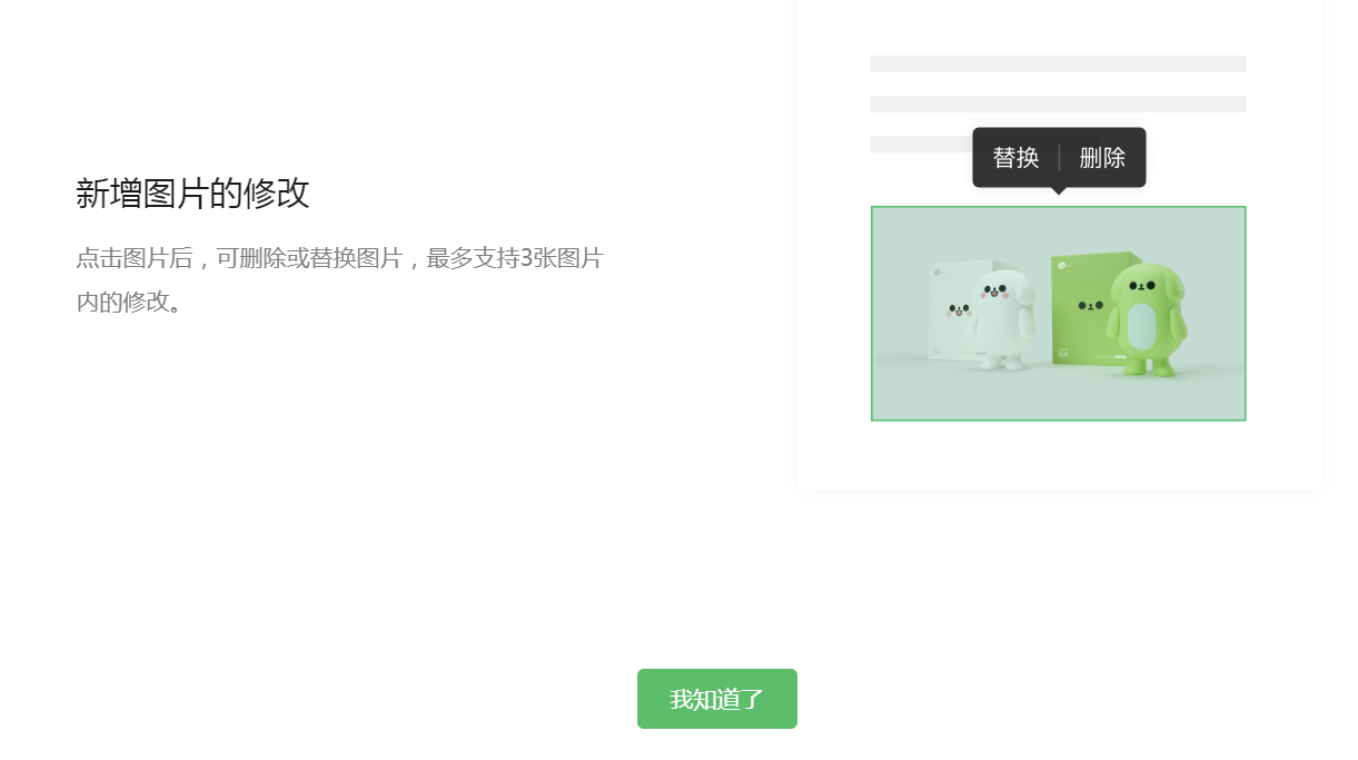 据悉,用户只需点击需要修改的图片,就会弹出“替换”和“修改”两个功能选项,选择“替换”,会弹出图片库以进行下一步选择新图片的操作;选择“删除”,则原图片变灰,且右上角出现“已删除”的标识。完成之后,同之前一样“提交修改”即可。