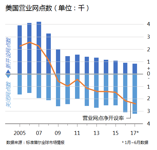 ★ 北美市场:据华尔街日报报道,截至2017年6月的12个月间,美国有1700个金融服务网点关闭,创下历史新高。预计,美国近80%的金融服务网点将关闭。此外,标准普尔全球市场情报的数据也表示,自2005年起至2017年,美国新开设的银行网点数在逐年下降,而关闭的银行网点数却呈现逐年升上的趋势