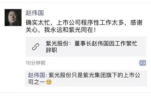 与此同时,赵伟国在朋友圈发文表示:“确实太忙,上市公司程序性工作太多,感谢关心,我永远和紫光同在”。