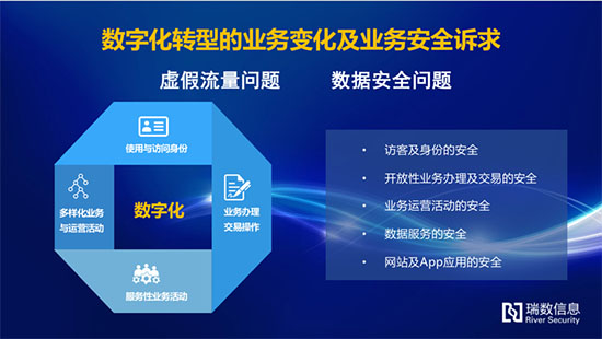 瑞数CSO马蔚彦提到:“数字化经济形式下,业务与安全共生,应用防护与业务风控交叠。企业从传统业务转向数字化业务,业务种类越来越多,用户资料、经营交易数据在大量流通,安全问题与业务问题共生连锁(流量、身份信息、交易信息以及一系列数据安全问题不断涌现)。