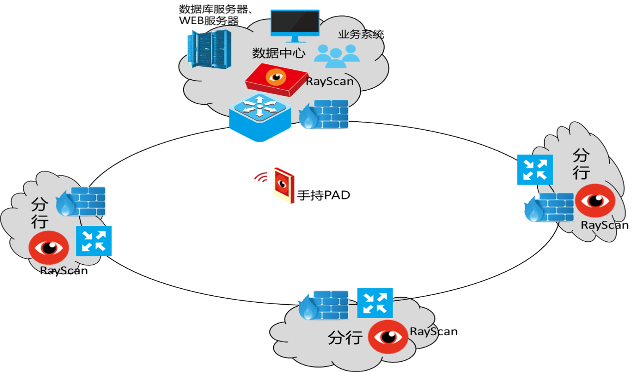 盛邦安全银行安全漏洞管理解决方案,将高端一体化漏洞评估系统旁接部署在核心交换机上,对全网网元进行资产识别、漏洞检查、弱口令扫描,涵盖桌面级SOHO设备、PAD扫描器、漏洞扫描器等组件。其中,桌面级SOHO设备部署在运维人员的工作区域,在有紧急扫描需求及日常验证等需求时使用;PAD扫描器供安全管理人员外出对分行进行垂直监查时使用,也可在空闲时接入网络当作轻量级工控机执行扫描任务;解决方案还支持虚拟化安装的漏洞扫描器,可以满足用户越来越普及的虚拟化IT环境。