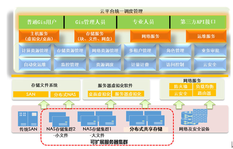 浪潮与Esri合作的GIS综合服务云平台,底层基础平台包括Incloud OpenStack、虚拟化系统InCloud Sphere、IncloudStorage、InCloud Network和云管平台InCloud Manager,搭载系统GIS管理系统、GIS业务系统、GIS数据库。平台采取了分层管理的方式,各层资源有序建设,可灵活伸缩。通过标准化技术,平台支持各种终端工具、网络接入,支持多地单云、多地多云等多种统管方式,满足各种GIS系统扩展需要。