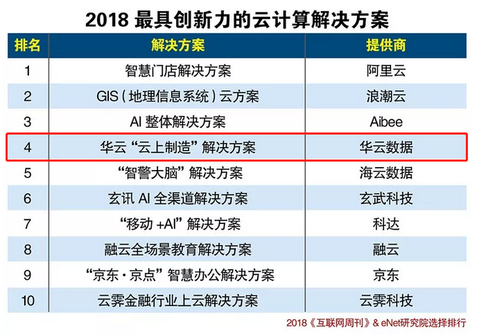 云数据“云上制造”解决方案入围2018最具创新力的云计算解决方案榜单