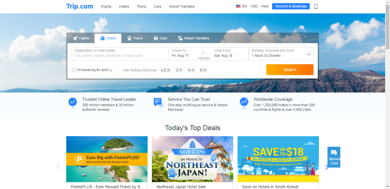Trip.com 提供13种语言的一站式旅游预定服务,涵盖机票、酒店、火车及汽车在内的出行预定服务。Trip.com拥有全球覆盖广泛的航班网络,提供超过200万条独立航线,连接5000多个城市,为国际旅客提供服务。凭借24/7全天候的客户服务,Trip.com为全球范围的旅行者提供全面的酒店、火车和汽车出游选择,以便他们在一个平台上实现搜索、预订及优质服务的无缝体验。