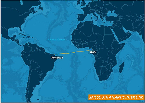 SAIL海缆系统由中国联通与喀麦隆电信共同投资,直连喀麦隆的克里比和巴西的福塔雷萨,全长约6,000公里,采用业界领先的100G传输技术,4对光纤,系统设计总容量达到32 Tbit/s。此项目由全球海缆行业领先的供应商华为海洋负责建造,系统使用带有钛合金外壳的海底光中继器,重量轻,强度高,更耐腐蚀,能够在海底稳定工作25年,为客户提供优质可靠的洲际通信服务。