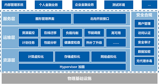 众所周知,安全绝对是所有金融机构最为看重的一项指标,这不仅关乎到金融机构及客户的资金安全,同时也是关系到机构信誉的“生死线”。山东农信同样也对系统安全提出了非常严苛的要求,要求系统的可靠性要达到99.999%。同时,山东农信业务量巨大,业务种类繁多,但由于机房空间有限,并且购买的服务器资源没有满载利用,新业务或者扩容业务再继续用传统服务器的话成本巨大,要求整套方案不仅能够将现有资源充分利用起来,而且要能够将存储网络和计算资源全都覆盖,达到即用即拿并且实现所有资源的统一管理,运维成本也要有所降低。