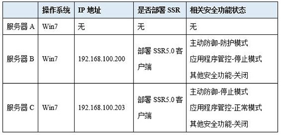 浪潮安全团队采用SSR5.0版本对GlobeImposter样本进行防护对比验证。验证环境中部署了三台Win7操作系统的服务器,其中服务器A不安装SSR,服务器B安装SSR并开启主动防护功能,服务器C安装SSR并开启应用程序管控功能。三台设备配置信息如下表所示: