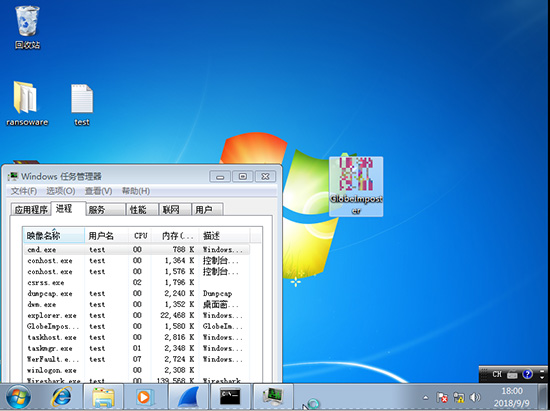 在服务器B中执行GlobeImposter样本,暂时未发现异常。查看任务管理器,发现GlobeImposter.exe已经执行,但桌面上的text.txt被未被加密,也未产生生成勒索文件信息Read_ME.html。