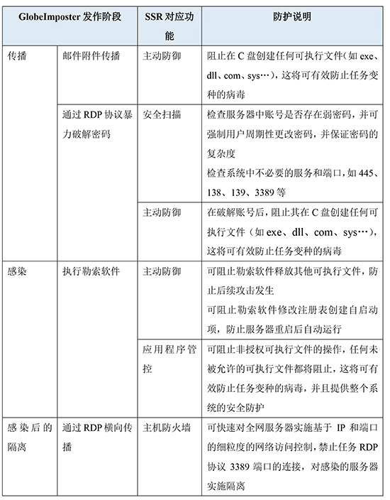 从GlobeImposter传播和感染的原理,以及实际验证的情况来看,SSR5.0版本主动防御功能和应用程序管控功能均有较好的防护效果。针对GlobeImposter发作的各个阶段,SSR提供了多维度的防护功能。