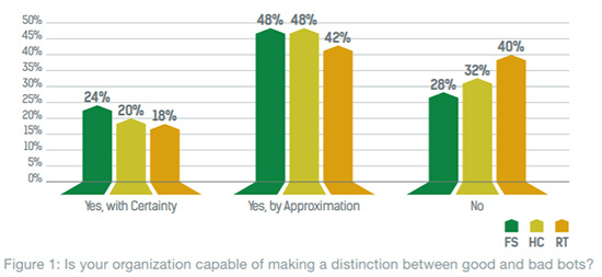 随计算机机器人程序崛起而来的是辨别不良计算机机器人程序和良性计算机机器人程序的安全风险。Radware研究显示,70%的网络流量都来自于计算机机器人程序,然而只有不到20%的受访者能区分良性计算机机器人程序和不良计算机机器人程序(见图1)。不良计算机机器人程序会通过Web刮取窃取知识产权,降低或窃取报价并扰乱库存管理,给零售商带来严重的经济损失。例如,“sneakerbots1”已经遍历了运动鞋市场,目前正在全部买下各类备受期待的产品,之后再在网上进行售卖。