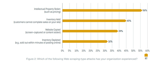 如前所述,计算机机器人程序是受访者需要认真对待的关键技术问题。对那些能够区分良性计算机机器人程序和不良计算机机器人程序的受访者而言,不良计算机机器人程序通常会以Web专区攻击的形式攻击零售商。事实上,75%的零售商称,Web刮取对他们的知识产权是一个很大的风险。Radware研究指出,72%的零售商都表示遭受了Web抓取攻击的影响,包括采集报价信息(56%)、冻结库存(45%)、网站复制(39%)和耗尽库存(32%) (见图2)。