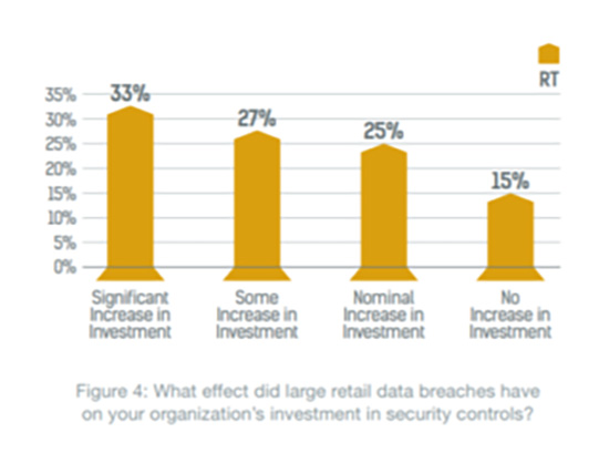 与医疗和金融服务等其他行业相比,接受调查的零售商并没有通过在安全控制方面进行投资的方式对全行业的安全违规行为做出回应,其中只有33%的企业大幅增加了投资。这情况很令人担忧,原因是60%以上的受访者正采集客户数据进行分析和个性化营销;缺少相关投资可能会让零售商更容易遭受到威胁和攻击。