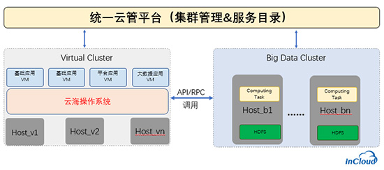 生产环境注重业务连续、平台稳定及数据安全性,考虑到大数据处理效率、HDFS多副本导致的冗余消耗及大数据应用的快速开发部署等诸多因素,浪潮采用大数据平台物理机部署、大数据应用云上部署、“云上”应用调用“云下”大数据平台能力,并通过统一云管平台实现虚拟集群及大数据集群的统一管理(智能监控,运维自动化、计量计费)、用户统一认证并提供统一的对外服务目录,实现了高效大数据处理、合理数据冗余、快速的应用部署、以及基于RBAC权限访问和以VDC维度的资源管理,最大限度发挥云计算与大数据融合的优势。