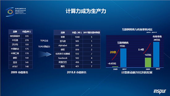 互联网经济的发展不仅体现在互联网产业,也体现在众多传统经济领域中,以传统零售业为例,从2009年到2017年传统零售产业增长了2.4倍,而互联网零售则增长了20倍,在整个零售产业中占比接近20%。产业互联网为传统产业带来了新的增长优势,计算力成为新兴产业发展及传统产业转型升级的“新动能”。