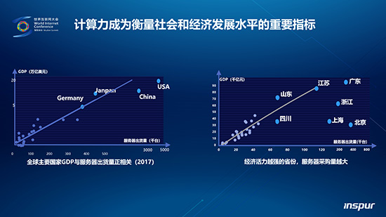 王恩东说,从技术上看,互联网对于经济的改变更多是计算对经济的改变,计算已经成为重要的社会生产力,成为衡量社会和经济发展水平的关键指标之一。首先,同一领域内,规模越大的公司服务器采购量就越大,例如,市值TOP7互联网公司也是服务器采购量的全球TOP7。其次,国家和地区的GDP规模与服务器出货量之间高度相关,甚至是线性相关,例如GDP与服务器出货量的前四位均为美国、中国、日本和德国。放眼国内,市场容量的地域分布与各省经济总量分布基本是正比例关系,上海、北京、浙江等发达地区每万亿GDP对应的服务器保有量远远高于全国平均水平。