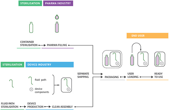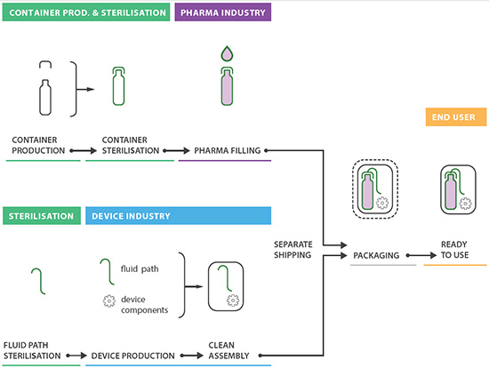 面对这一难题,首先可以想到的解决方案是让两个行业分开,并都继续采用自己的成熟的流程(图1)。根据这一思路,设计师设计出了用户灌装式产品,将药物和装置放在不同的包装内,用户需要将药物灌装到给药装置中。市场上已经出现这种产品,例如一次性胰岛素装置。这种方法意味着消毒过程已经完成;每家生产商都得以保持其原有的供应链;装置制造商无需负责处理药物,药物灌装者也无需进行组装操作。无论是从技术角度,还是从质量、责任和风险管理的角度,这种方法都对厂家有很大的益处。