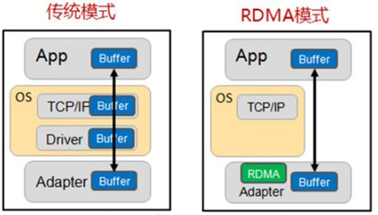RDMA(Remote Direct Memory Access)全称远程直接数据存取,就是为了解决网络传输中服务器端数据处理的延迟而产生的。RDMA通过网络把资料直接传入计算机的存储区,将数据从一个系统快速移动到远程系统存储器中,而不对操作系统造成任何影响,这样就不需要用到多少计算机的处理功能。它消除了外部存储器复制和上下文切换的开销,因而能解放内存带宽和CPU周期用于改进应用系统性能。下图直观的展示了传统模式和RDMA模式下的差异: