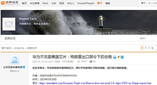 2019年5月19日,华为在“心声社区”刊发了创始人兼总裁任正非18日接受日本媒体采访的消息。任正非当天在深圳公司总部表示,即使高通和其他美国供应商不向华为出售芯片,华为也“没问题”,因为“我们已经为此做好了准备”。这是美国发布华为贸易禁令以后,他首次接受采访。