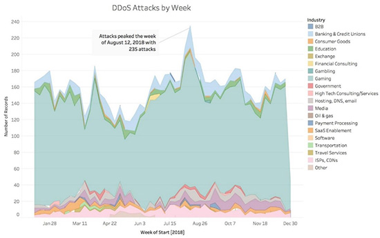 由于对发起攻击者的技术水平要求较低,DDoS成为最常见的攻击方式,它以流量型攻击和应用层攻击为主,主要通过大量僵尸网络对目标发起攻击,让目标带宽瘫痪或服务器崩溃,导致普通用户无法正常访问。DDoS攻击很少是单一事件,而是一浪接一浪,一旦遭到攻击就需为后续威胁做好充分准备。根据Akamai的监测数据,游戏行业在2018年全年都是最易遭受DDoS攻击的行业(见图二)。