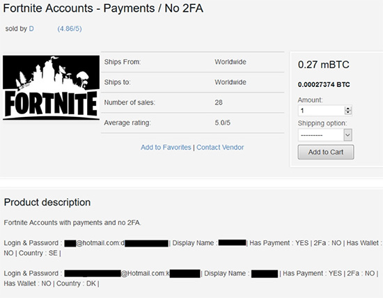 “玩家被盗号”常常是撞库攻击在作祟。游戏撞库的攻击目标即获取用户信息数据库,出售帐户信息的最终目的也就不言而喻。根据Akamai调查,超过一半的玩家在游戏帐户遭到入侵之后的经济损失在100到1000美元之间。 暗网上每个游戏帐户的最低价格可低至1.3美元。此前,《堡垒之夜》的玩家帐户信息在黑产市场进行兜售(见图四)。 2018年2月,再次曝出多名《堡垒之夜》玩家的游戏帐户被盗取200到500美元不等金额的情况。