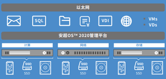 安超OS TM通过软件定义的方式,提供计算、存储、网络等虚拟化功能和策略制定,能够满足客户对Web应用、数据库、OA等一般应用基础架构的需求。