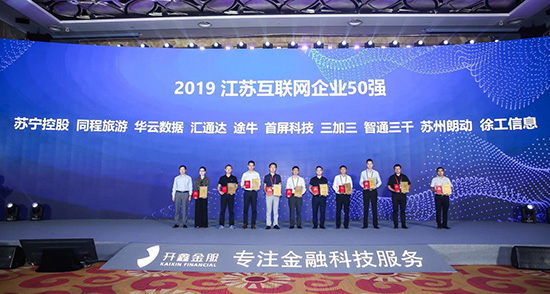 登台领取“2019江苏省互联网企业50强”证书和奖状