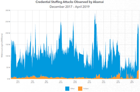 银行和金融服务机构的后台必须能够看到它们的网络和应用程序环境,从而了解各个平台流量正常时的情况;另一方面,他们也需要监控异常流量的信号。针对各个行业的撞库攻击(黑客使用窃取的用户名/密码组合获取用户账户访问权限的网络攻击)日益严峻,其中包括金融服务行业。根据Akamai最新发布的《互联网发展状况安全报告》 ,2017年11月至2019年4月期间,全球6.1%的恶意登录操作针对金融行业(图一)。如果银行和金融服务机构未部署能够迅速发现恶意攻击并阻止此类攻击的威胁情报系统,则会对银行和金融服务行业的用户、会员、员工以及整体声誉造成无法补救的伤害。虽然可以通过爬虫黑名单这一简单的方法阻止“反复攻击者”,但银行和金融服务机构还应考虑与第三方安全专家合作,一同为自己和用户的业务提供长期保护。