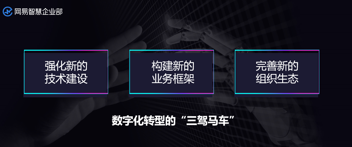 2.0阶段的数字化转型的另一个显著特征是,技术与传统企业的核心业务捆绑得越来越紧密。因此,摆在企业面前的任务必然艰巨。阮良认为,数据化转型成功与否的因素是多层且复杂的,网易在持续多年深耕企业服务领域中发现,驱动数字化转型的“三驾马车”,即:强化新的技术建设、构建新的业务框架以及完善新的组织生态,将发挥越来越关键的作用。