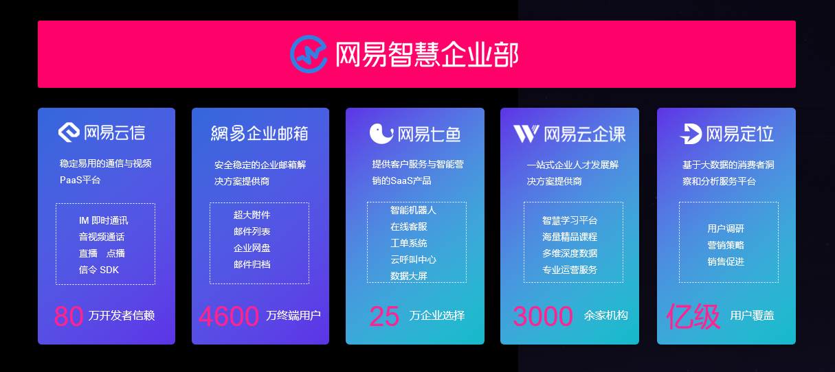 数字化转型着眼的是企业的长远利益。正因为此,网易秉持着“全价值链理念”的原则,在服务客户现有需求的同时,投身于前瞻性的技术与解决方案开发,赋予其更多的可能性。阮良介绍,过往几年间,网易企业服务的业务版图不断拓展。譬如,网易云信以稳定、易用、安全、灵活的视频与通信PaaS平台,对外输出技术能力。提供服务营销一体化解决方案的网易七鱼,可有效地驱动企业服务效率与智能营销能力的升级。网易定位覆盖亿级用户,依托于大数据能力为企业提供消费者洞察、营销、分析服务,进行精准投放。这两者相结合“变身“服务营销多面手,帮助客户共建业务中台。网易云企课则可提供一站式企业人才发展解决方案,满足企业的大规模且有效的内部培训需求。而依托22年邮箱专业运营经验的网易企业邮箱具有安全稳定且功能全面的整合方案,如今已进驻超过76万家企业。网易云企课与网易企业邮箱的结合可以帮助客户简单有效地重塑组织结构,强化组织赋能。