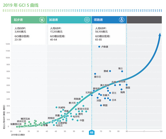 2016年的GCI报告识别了新兴国家的增长拐点,即当新兴国家的GCI得分超过35分时,其ICT基础设施投资将带来GDP倍增效应。GCI 2019发现,数字经济发展的领先者,也就是位于GCI S曲线上方的国家,也能通过数字经济拐点刺激经济增长,当一个国家的GCI得分达到65分时,S曲线有了新的陡峭,意味着这些国家将有望进入经济发展的新周期。研究表明,处在GCI最高分值区间的国家,得分每提升1分,通过有效利用智能联接,其经济增速高达其他国家的2.4倍。