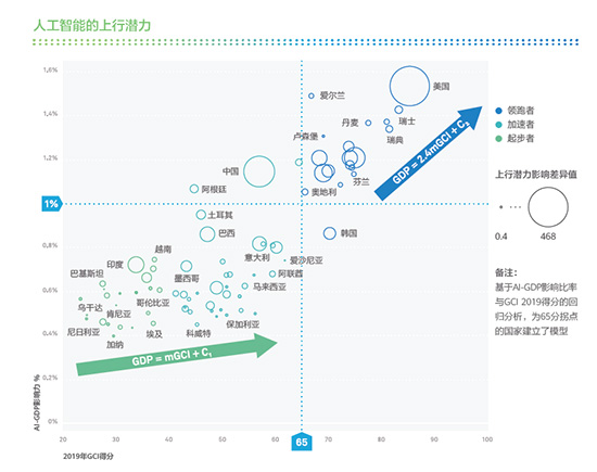 研究同时看到,并不是只有发达国家才能从智能联接中获益。研究表明,当人工智能应用于行业和组织时,不论处于数字化发展的哪个阶段,各国都能挖掘人工智能的“上行潜力”,推动国家GDP增长。