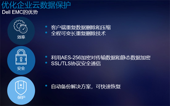 • 戴尔科技集团为用户提供经济高效的云端备份解决方案,保护其云中重要应用,数据在云端和本地数据中心之间可复制实现异地数据保护