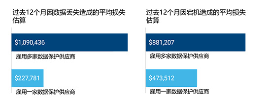 80%的受访者表示,他们采用了多家数据保护供应商的解决方案。奇怪的是,这些组织愿意投入更多时间、金钱、人力资源来保护数据和应用程序,但他们每年因数据丢失和宕机所产生的损失却比仅雇用一家数据保护供应商的组织要高得多。