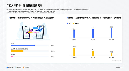 在针对消费者对客服使用需求的研究中发现,62.6%的受访者更愿意选择真人客服, 35.3%的人表示只要能够解决问题即可, 只有2.1%的受访者明确表示更喜欢机器人客服。并且, 81.5%的被访者希望被明确告知接待的客服是否为机器人客服。不少被访者表示“与机器人寒暄”场景下的服务效果不甚理想。而对于不同年龄层消费者的针对性研究表明, 年轻人对机器人客服的接受程度更高, 而高年龄人群对真人客服的偏好相对明显。