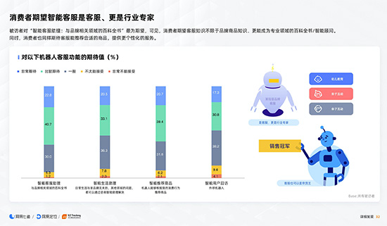 能做到上述功能, 只算是轻松跨过了及格线, 因为消费者对客服的期待不止于此。被访者认为,目前客服在“问题解决”方面所表现的作用虽然很强, 但是相对而言, 在“咨询品牌所在垂直领域的延伸知识”场景下的服务效果不甚理想。这意味着,消费者期待客服不仅能解决问题,还应成为垂直领域的专家,懂得他们的所想所需。调查数据显示, 消费者对智能客服助理能成为专业领域的百科全书和智能顾问的期待值高达63.5%, 其中有40.7%的受访者表示对此非常期待。