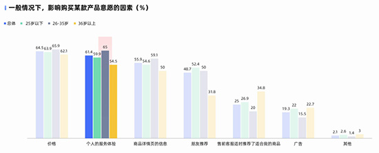 在七鱼报告得出的2020电商客服9大趋势中提示,服务体验决定着“一切“。消费者的服务体验会显著影响他们的品牌偏好和购买决策。例如,除去价格因素,个人服务体验(61.4%)是影响产品购买意愿的主要因素。并且,Z时代的消费者,尤其是年轻人对服务体验的评价标准也越来越“苛刻”,26-35岁的人群对于服务体验的期待以65%的比例高出平均值。而他们正是目前网购消费人群的主力军。