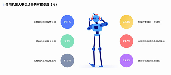 目前,这个需求下的典型场景就是外呼机器人。众所周知,这一直都是个不太“讨喜”的沟通方式。报告数据也显示,仅25.3%的被访者对机器人打过来的电话表示满意,其中表示非常满意的占比为4.0%。24.3%的被访者选择不太能接受机器人电话的原因是“不喜欢被骚扰”;23.3%的被访者认为机器人电话的“沟通效率非常低下”;14.4%的被访者表示“感觉没有被尊重”。七鱼得出,进一步提升机器人沟通的效率以及机器人服务的亲和力,是有效优化消费者对于外呼机器人体验的关键。