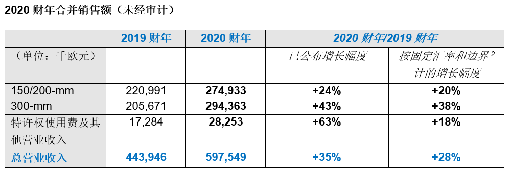 与2019财年相比,2020财年第四季度的销售额创历史新高,按固定汇率和边界2计,集团全年增长率高达28.3%。按固定汇率计,150/200-mm晶圆销售额较2019财年增长20%,而300-mm晶圆销售额增长了38%。两者销售额的增长均主要受到RF-SOI晶圆的销量推动。