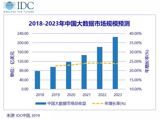 IDC预测,中国大数据市场总体收益持续保持快速增长,2019-2023年预测期内的年CAGR(复合年均增长率)为23.5%,增速高于全球平均水平。到2023年,市场规模则将增长至224.9亿美元。