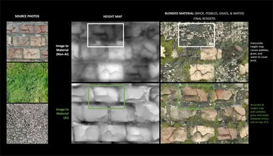 AI驱动的Image to Material取代了Bitmap 2 Material(B2M)功能,将照片导入到Alchemist当中。因为没有AI助力,B2M难以正确识别图像中的形状,这让艺术家不得不花费更多时间对纹理贴图进行手动细化、调整和消光。
