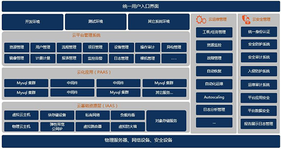 针对山西路桥集团的需求,华云数据旨在“以小步快跑、稳扎稳打、分期建设、深入云化”为项目设计建设宗旨,为山西路桥集团搭建私有云平台。云平台整体架构基于普通x86服务器运行,使用通用网络设备及安全解决方案,通过云平台将硬件资源池化,形成计算资源池、网络资源池、存储资源池。同时,云平台通过重新划分资源和全局调度管理,可向山西路桥集团快速交付云服务器、云存储、云数据库、私有网络、虚拟路由器、虚拟负载均衡等云计算相关产品,平台中所有子系统均使用统一用户账号登录和管理。