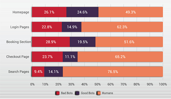 航空公司、运输公司和连锁酒店等旅游和酒店行业企业非常依赖网上订购。犯罪分子主要利用类人的分布式变异机器人程序绕过安全工具,对他们的网站进行攻击。近三分之二的访问其网站的广告机器人程序都被认定为是复杂机器人程序。